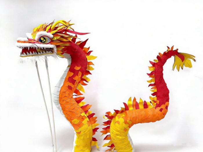 展区中央,一尊1.8米高的手工龙塑作品气势恢宏。创作者以废旧排烟管、铁丝搭建龙身骨架,践行“变废为宝”的环保理念;用超轻黏土塑出龙头轮廓,红、橙、黄三色海绵纸剪裁成龙鳞与装饰,金葱纸点缀纹路,棉花填充龙须与嘴部,经裁剪、塑形、粘贴等工序,让巨龙栩栩如生。这件作品既传承中华龙图腾的文化内涵,又融合传统与现代手工技艺,创作者在实践中锤炼动手能力与空间想象力,深化龙文化认知、树立环保意识,实现美育、环保教育与非遗传承的深度联动。